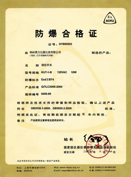 液位開關防爆合格證